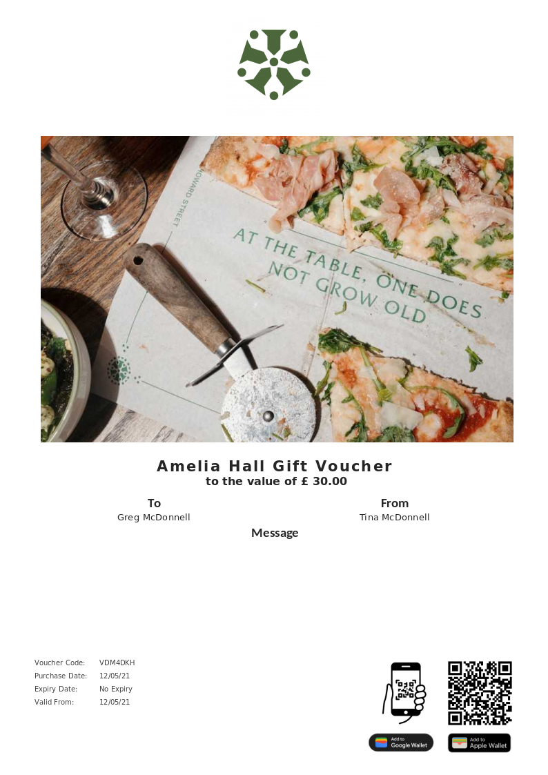 Amelia Hall allows you to purchase instantly printable gift vouchers, special offers and tickets using the Voucher Connect platform.